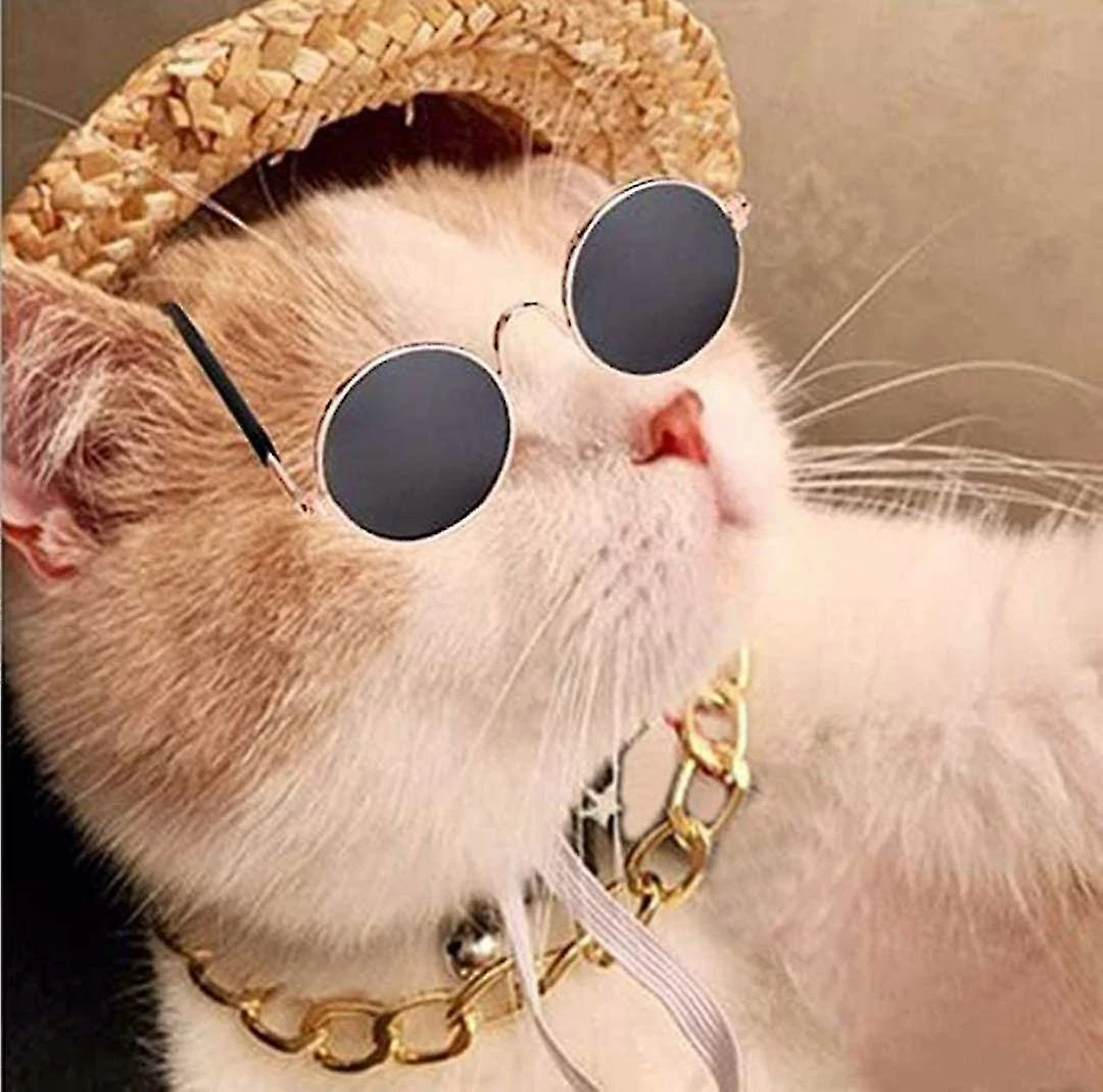 Material: Hat: straw; Sunglass: AC lens + Metal frame; Gold collar: MetalSize: Hat: 6.3 in(Outer Diameter); 3.15 in (Inner Diameter); 1.96(Height); Sunglass: 3.15 in(Total Length) , 2.87 in(Glasses Leg Length); Gold collar: 3.15 in(Length). Package Included:1x Hat, 1 x Sunglasses, 1 x Collar ChainCute and Cool Design: Great for vacation photosPerfect for pet parties, weekend parties, birthday parties, photo shoots, daily wear or any other occassionsSuitable for cat, small-sized dogs like Chihuahua, Teddy, Schnauzer, Pomeranian, Small Poodle, Yorkshire, Shorthair, Persian, Puppet, etc