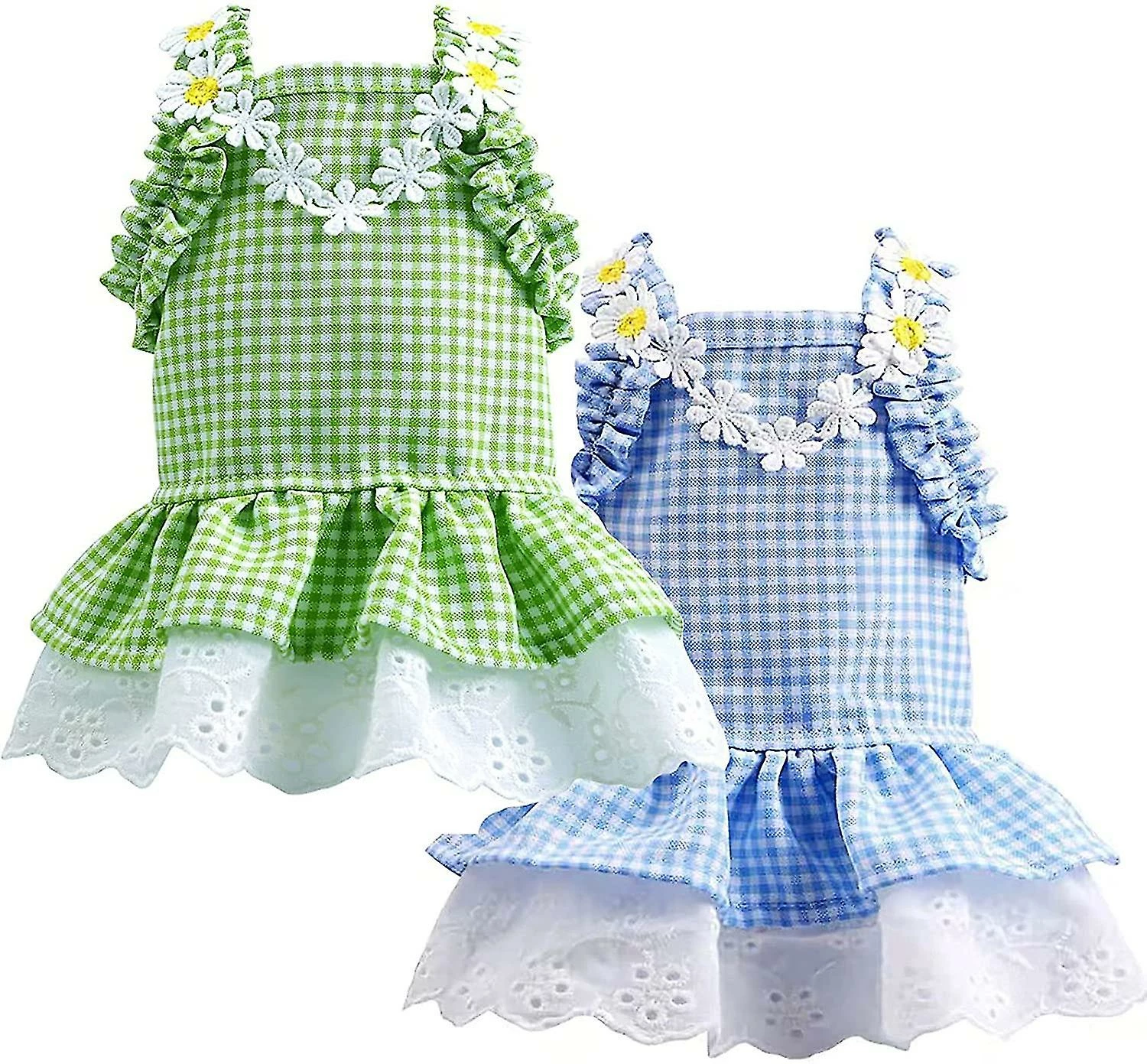 2 ROBES PACK POUR PETYou recevront 2 pièces de robes de chien avec différentes couleurs vives, bleu + vert, bleu + jaune. Jolie robe de princesse à carreaux. Parfait pour les vêtements de tous les jours, les vacances et les photos.^