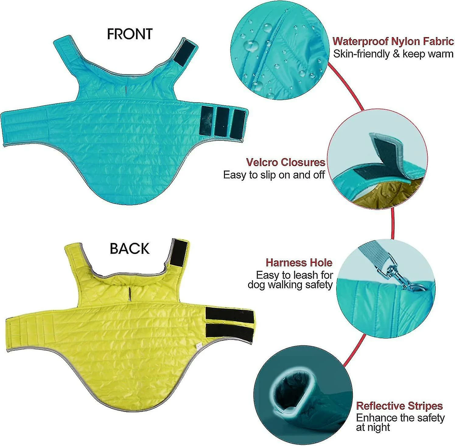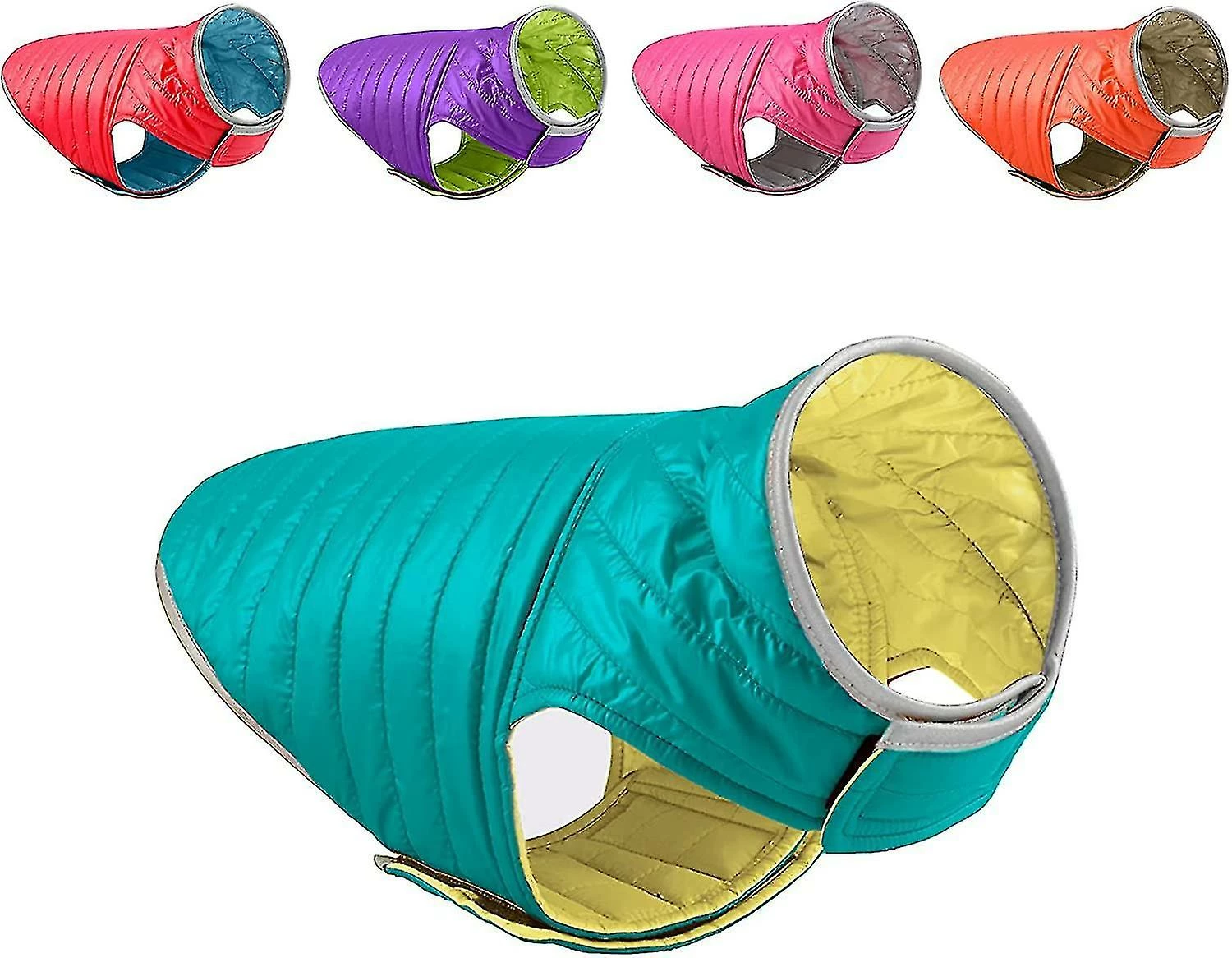 BAOYE Double-sided Reflective Warm CoatOur winter fashion dog clothing is double-sided, two pieces in one coat. Reflective pipes are visible in the dark. This reversible reflective dog vest is perfect for keeping your dog warm while walking, hiking and running in the cold fall winter.Premium MaterialThe winter dog coat is made of high-quality nylon fabric and technical double down cotton, which is light, waterproof, windproof and easy to care for. The soft inner padding provides great warmth and comfort to keep your dog warm without overheating, ensuring your dog’s freedom of movement.Adjustable DesignThe dog’s abdomen and neck are designed with Velcro, which can adjust the size of the dog’s clothes and perfectly fit the body shape of more dogs. Warm dog jacket with Velcro closure for easy donning. Belt entry design so you can easily connect the belt/lead.Creative GiftsDouble-sided dog winter coat, new design with bright colors, makes your dog the center of attention in the crowd, it is a good gift for pet puppies. Christmas is almost here and the dog vest is the perfect gift for kids, friends and loved ones to dress up their dogs in style and function.Delivery Quantity: 1 PieceProduct color: blue + yellowProduct size: XS about -24cm*36