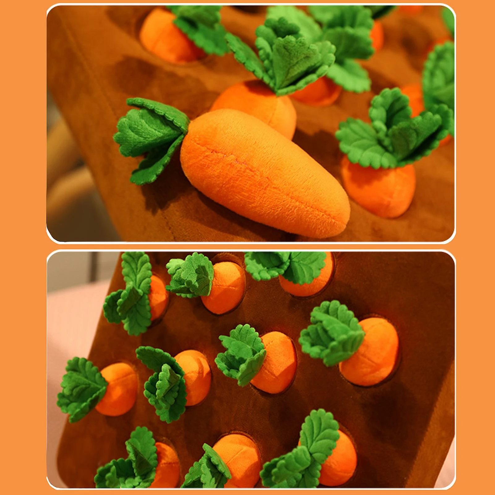 2. Fun Shape: The carrot has a fun shape, you can pull out the carrot to hide the food in the hole, help the dog eat slowly, and also keep the dog focused, even if the dog is alone at home, it can keep it busy. 3. Exquisite Craftsmanship: Anti-skid designed on the back of the mat, the mat will not slide when the dog is playing, and the carrots are neatly sewn and strong, not afraid of being bitten by pets. 4. Comfortable Fabric: The mat is made of high-quality crystal cotton soft fabric with high resilience, detachable, and machine washable with carrots. 5. Perfect Gift: It can be a gift for family and friends who have pets, or for your own pets, also can be the early learning toy for kids. Specification: Material: Cloth Product Color: Orange Product Size: 35 x 35cm Product Weight: 500g Package Included: 1 Set x Carrot Farm Toys