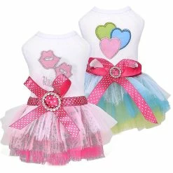 2.Classic cute girl dog clothes Lips,love heart pattern and Kiss me letter,pink tutu and green tutu dress design adds charm to your puppy small chihuahua girl, round neck clothing easy it.valentine dog dress dog birthday dress dog princess costume cute dress dog puppy wedding dress dog tutus for small dogs yorkie dresses for girls