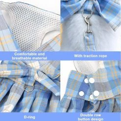 Design The clothes adopt the style of JK uniform college, which is very cute. There is a D-shaped traction rope loop on the back, which is convenient for dogs to travel.